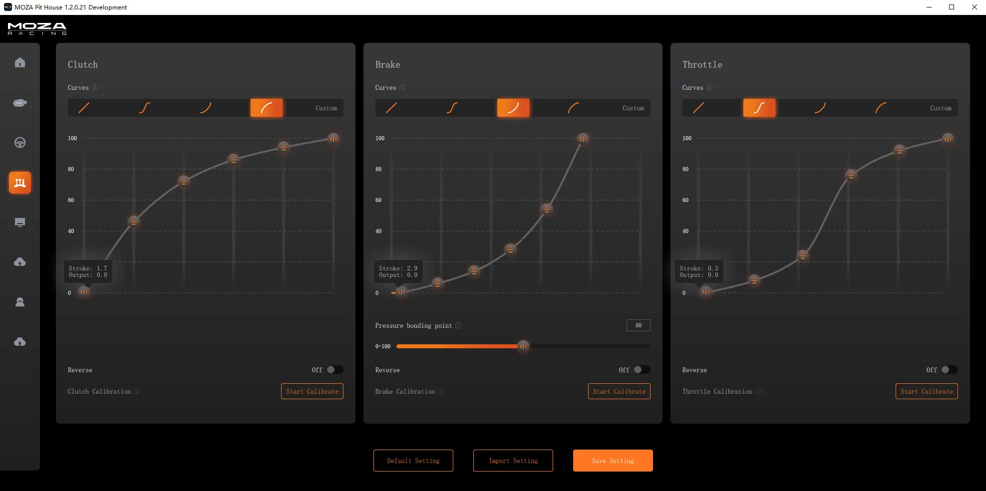 MOZA's Pit House allows for easy configuration of the pedal output curves according to different needs.