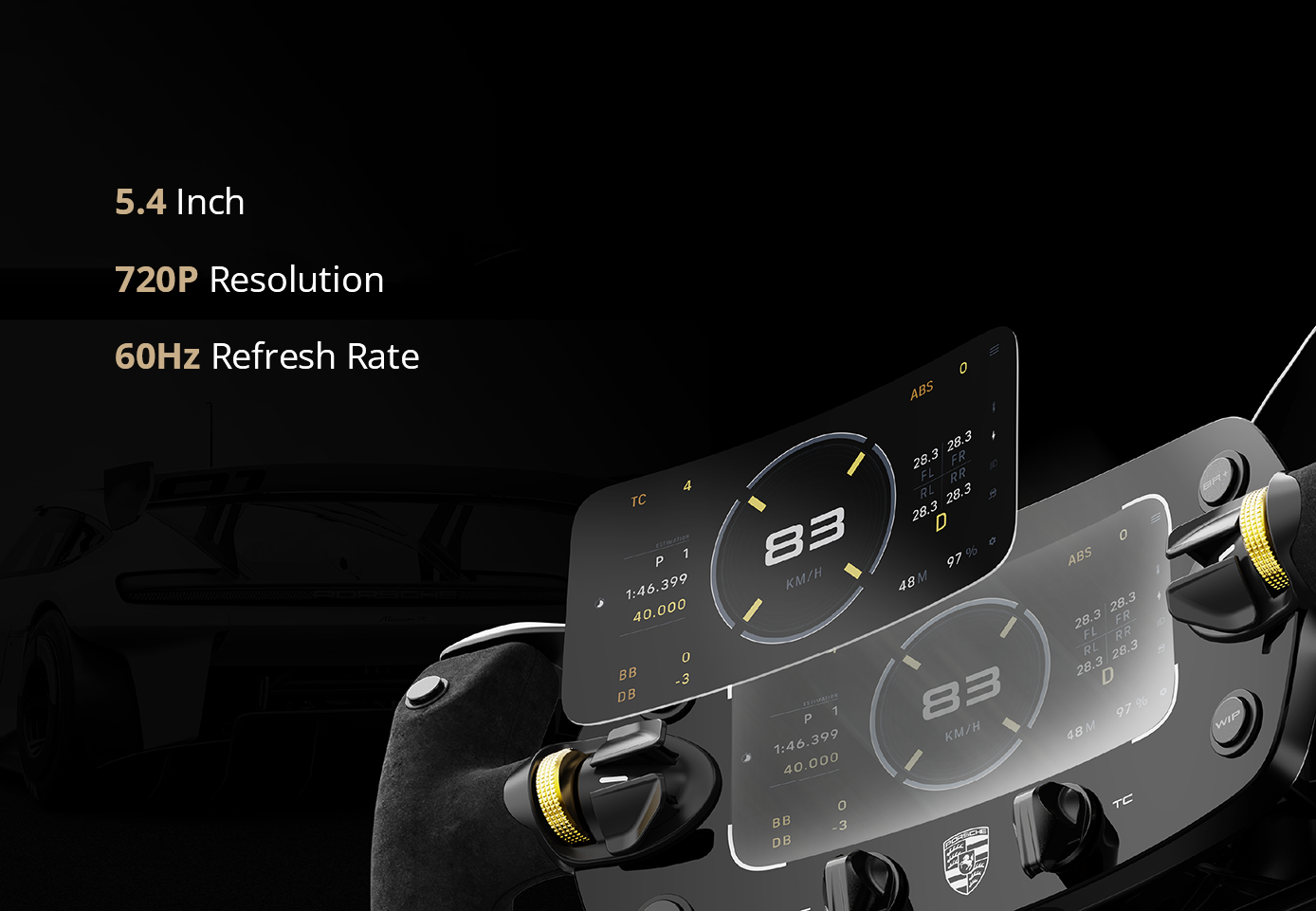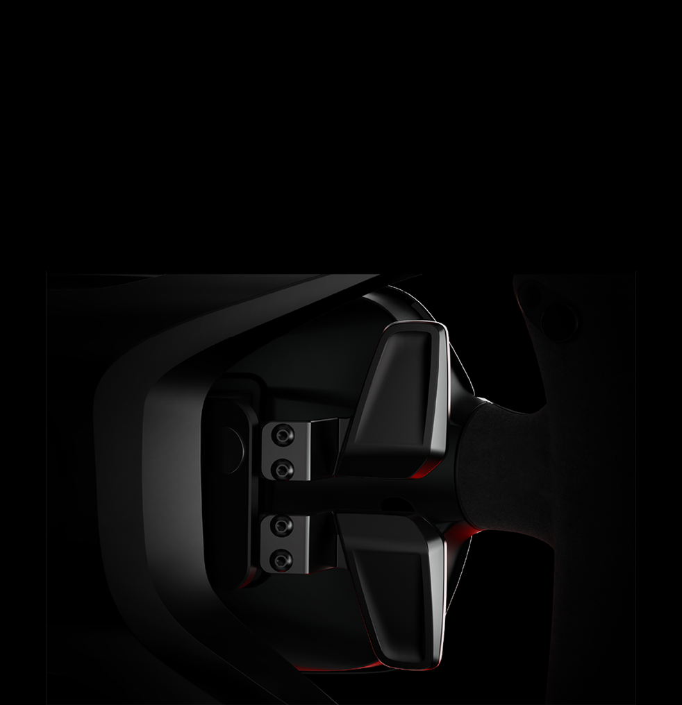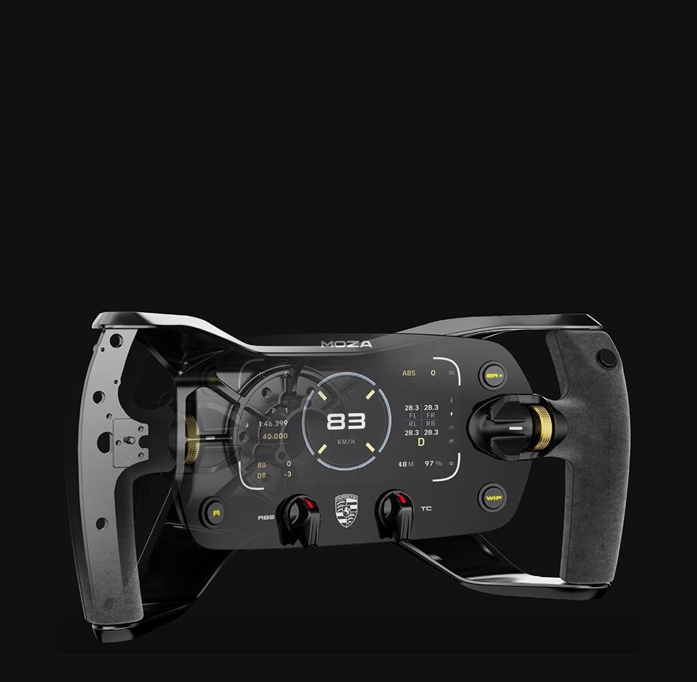 The MOZA Porsche Mission R Steering Wheel is an officially licensed replica crafted with Porsche's original CAD data. Featuring a 5.4-inch flexible OLED display, CNC-machined aluminum frame, suede-like grips, and dual-clutch magnetic paddles, it delivers the ultimate balance of authenticity, performance, and comfort for professional sim racing.